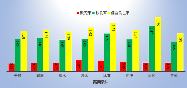 不同路面条件会影响事故伤亡情况(见图3)。从致死率来看,漫水、冰雪、泥泞道路发生交通事故死亡率更高。从致伤率来看,油污、冰雪、潮湿路面发生交通事故受伤率更高。从综合伤亡率来看,油污、冰雪、潮湿路面发生交通事故伤亡程度严重。可见冰雪路面对事故伤亡程度的影响最为显著。